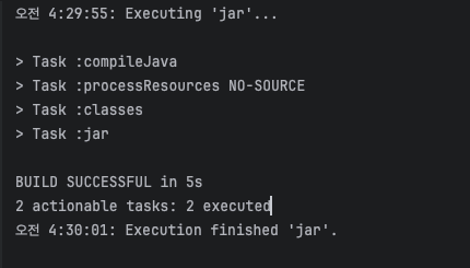 - 그레이들 Jar build 명령어 수행 시 컴파일 테스크를 수행함을 알 수 있다